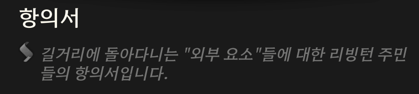 리빙턴에 파견된 불주먹 대원들은 전부 난민들 치안 관리가 임무 아니었나요? 그런데 이건 뭡니까? 덩치가 산만하고 악취가 진동하는 난민들이, 수용소에 얌전히 숨어있기는커녕 허름한 차림으로 리빙턴 거리를 자기 뒷마당인 것처럼 돌아다니고 있어요. 경고합니다. 저희 종조모께서 리아라 포티어 영관님과 개인적인 친분이 있습니다. 난민들을 단속해서 제자리에 돌려놓지 않으면, 영관님께 당장 알리겠어요!