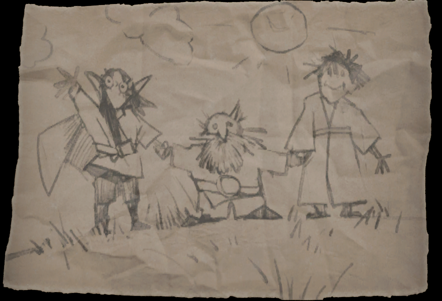 [이 석판의 그림은 석판 자체를 뚫을 듯한 강한 힘으로 새겨져 있습니다. 각종 주문과 무기를 나타내는 그림 가운데 누군가가 홀로 서 있습니다. 그는 머리를 숙이고 있으며, 양쪽으로 뻗은 팔은 두 바위 사이에 묶여 있습니다.]