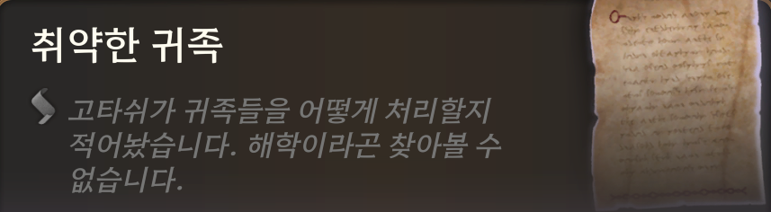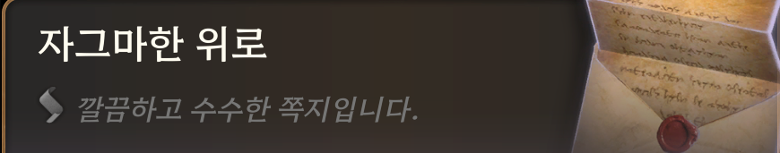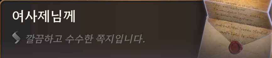 다만, 저택에서 경을 반길 것 같지는 않습니다. 지난 방문이 좋게 끝난 것은 아니니까요.(You didn't exactly leave on the best of terms.) 하지만 이는 경의 일이니, 저나 다른 이들보다는 경께서 가장 잘 아시리라 믿습니다.