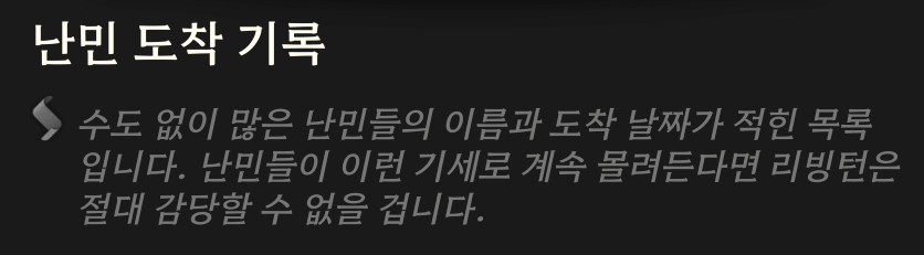 [지난 열흘 동안 리빙턴에 도착한 난민들을 기록한 불주먹 문서입니다. 지난 5일 동안 유입 난민 수가 증가한 것을 볼 수 있습니다. 웜 건널목 바깥 마을에서는 난민을 전부 수용할 수 없음이 명백합니다. 목록에 기록된 이름 중 일부를 살펴보면 다음과 같습니다.]