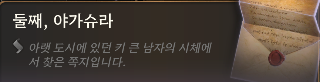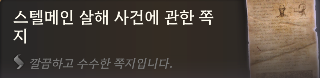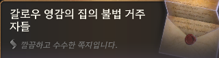 - 주소를 밝히기 거부한 익명의 엘프가 제보. 필그레이브 저택 주변에 수상한 자가 출몰한다는 내용.