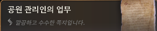 배수 및 지하도 관리부에서는 현재 도시 하수도로 통하는 맨홀에서 악취가 나오고 있다는 문제를 인지하고 있습니다. 위생 관리 터널의 원활한 흐름을 유지하기 위해 고용했던 시궁창 코볼트족이 원인 불명의 상황 또는 무력에 의해 목숨을 잃었거나 쫓겨난 것으로 보이며, 그로 인해 불쾌한 악취가 발생한 것으로 파악하고 있습니다. 현재 관리부에서 상황을 해결하기 위해 적절한 조치를 취하고 있으니, 시민 여러분께서는 직접 상황을 해결하고자 나서지 마시길 바랍니다. 시민 여러분의 맨홀 이용은 금지됐습니다. 위생 관리는 전문가에게 맡겨 주십시오!